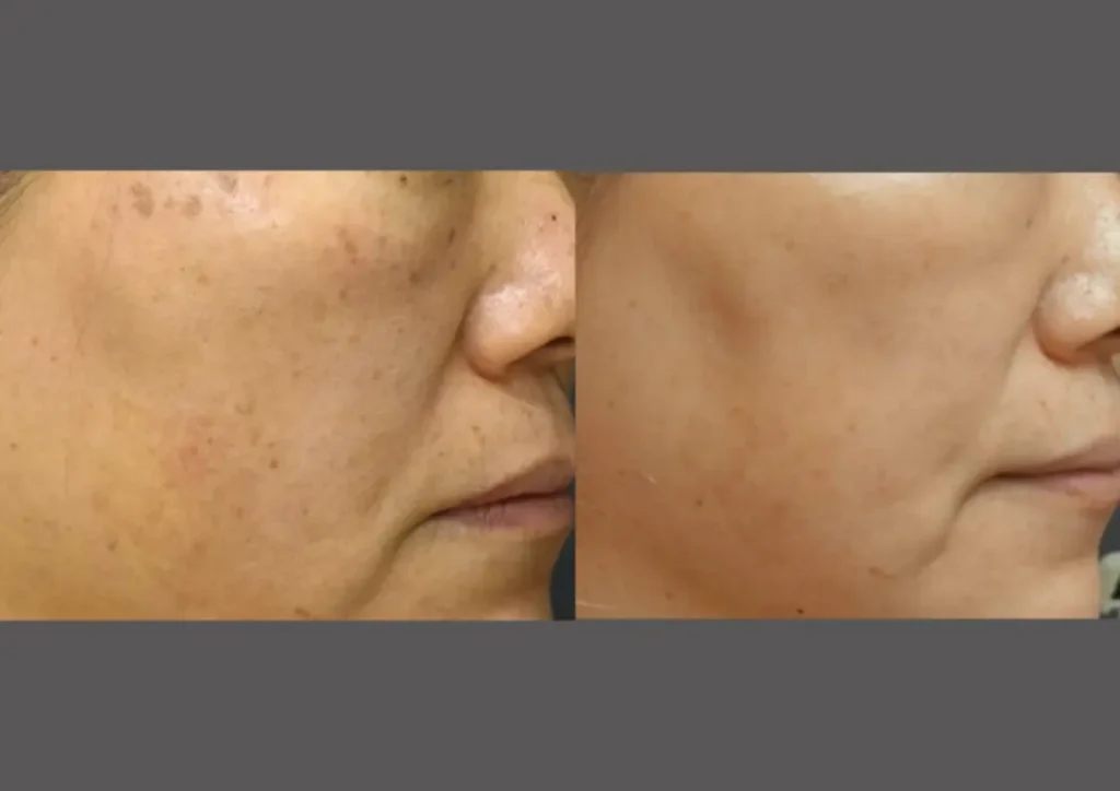 まだとれきっていないかさぶたもありますが、すでにシミとくすみの除去のみならず、ほうれい線が浅くなりリフトアップの効果がわかります。