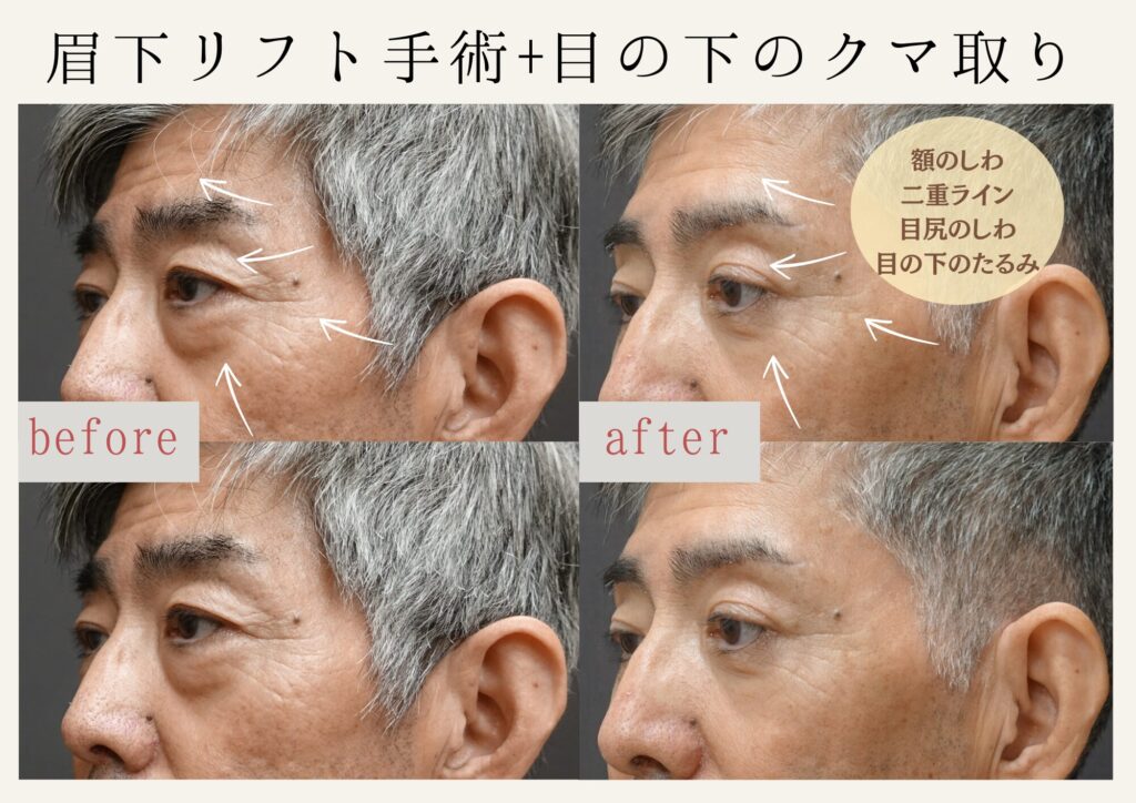 また、疲れて見えてしまう目の下のクマ、目袋とも呼ばれる目の下のふくらみ、または他院にて脂肪取りをおこなったあとのたるみ、小じわの集まった皮膚をとる手術もおこなっております。